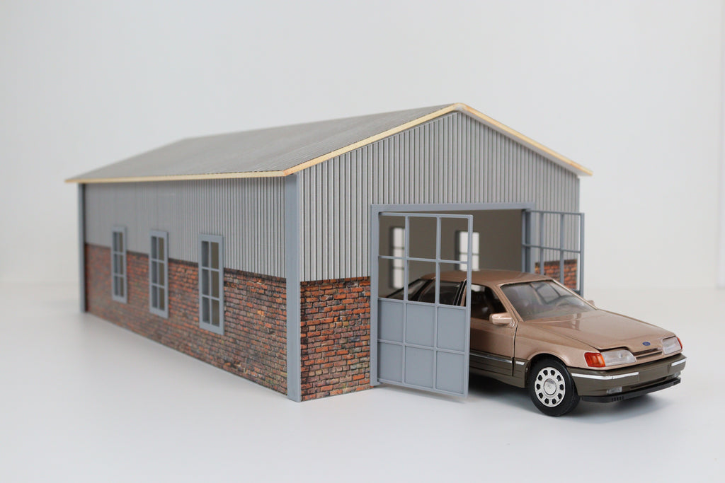 Made from durable PVC and plastic, this high-quality model features an industrial barn-style structure with brick and corrugated metal textures, large sliding doors, and realistic windows—perfect for showcasing classic cars, race cars, and motorcycles.
