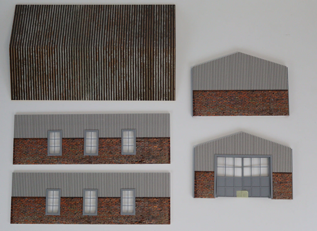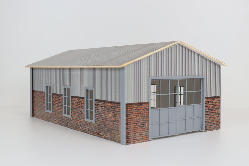 Realistic Design – Features a corrugated metal roof, brick-textured lower walls, large industrial-style sliding doors, and detailed window frames.